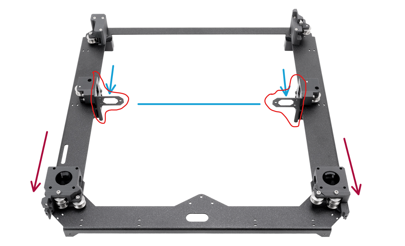 Dalším ale už neřešitelným problémem bylo neustálé rozladění dorazů osy X. I když bylo na začátku tiskového dne vše zkontrolováno, dotaženo, seřízeno, tak po vychladnutí druhý den osa X znovu vykazovala malé vůle u předního dorazu většinou na levé straně, což následně způsobovalo při homingu delší dobu oklepávaní tiskové hlavy a někdy to tiskárna vyhodnotila i jako chybu při kalibraci počátku. A to mě začalo hooodně štvát. Zjistil jsem, že na vině je uložení této osy, které je na ohnutých L plechách (viz obrázek níže), které jednak nejsou ohnuty přesně do pravého úhlu a ještě k tomu stále pruží, to znamená že sestava není tuhá, a tak dochází k neustálému rozlaďování dorazů osy X.