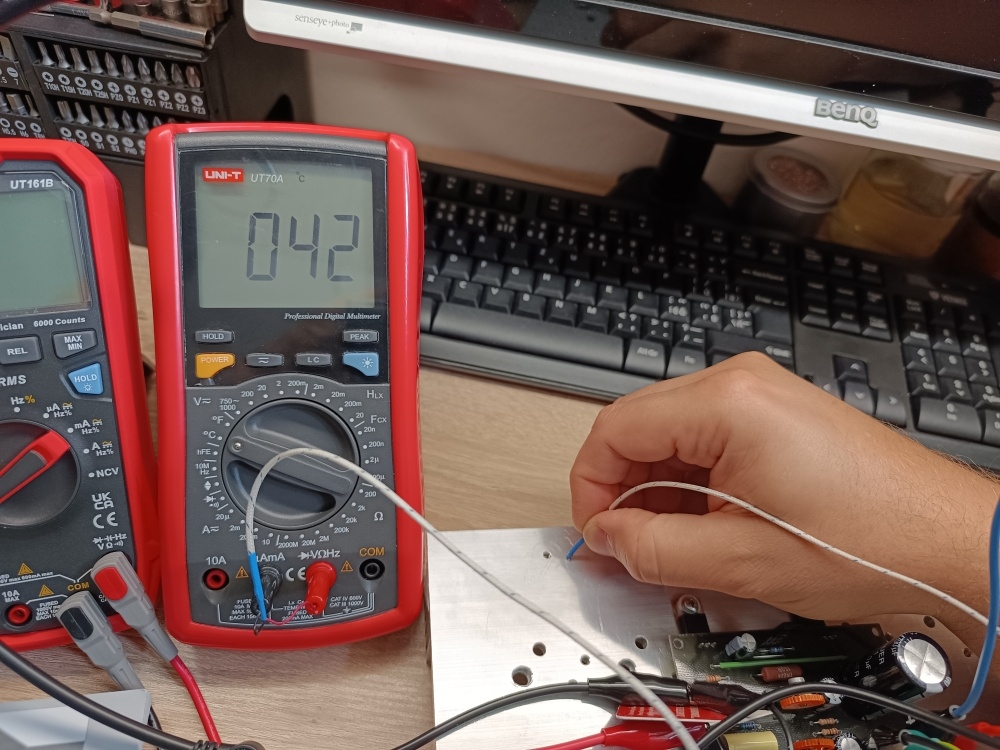 Naměřené teploty po ustálení (1 hodina při plném výkonu při teplotě okolí 20°C) tranzistor T1 = 64°C, T2 = 58°C, pasivní chladič 42°C