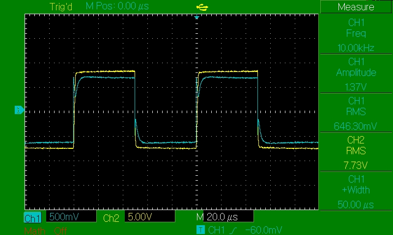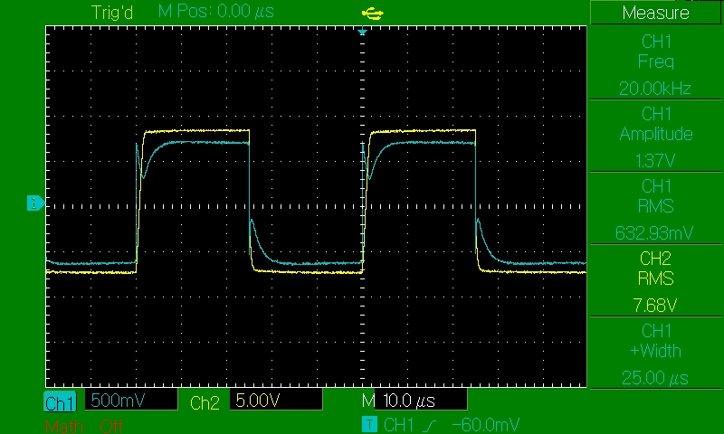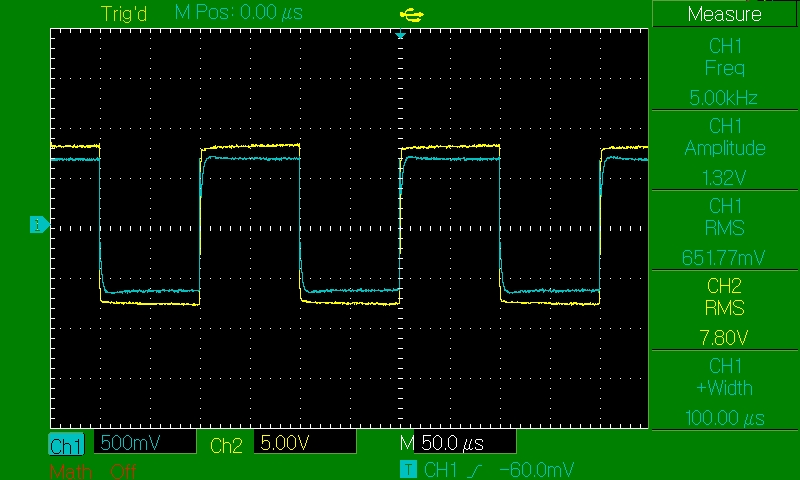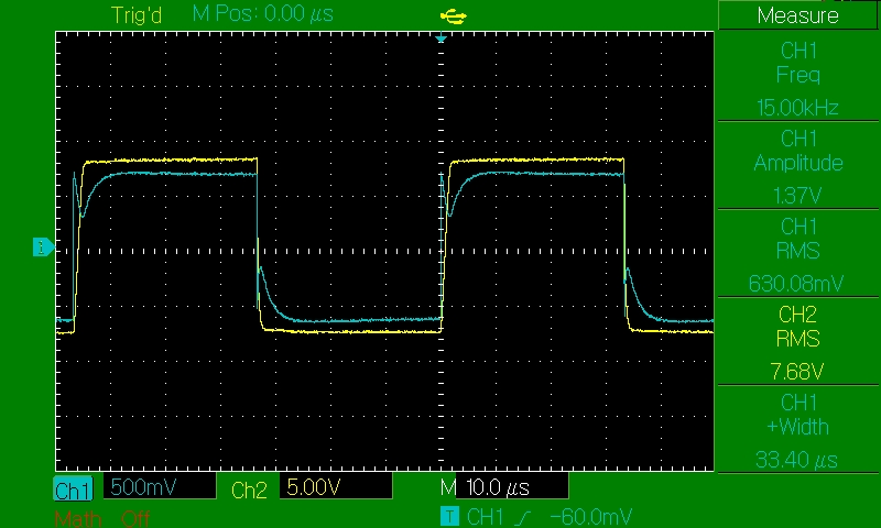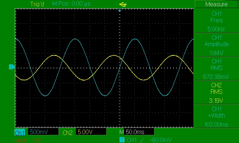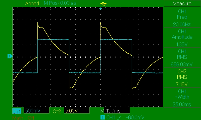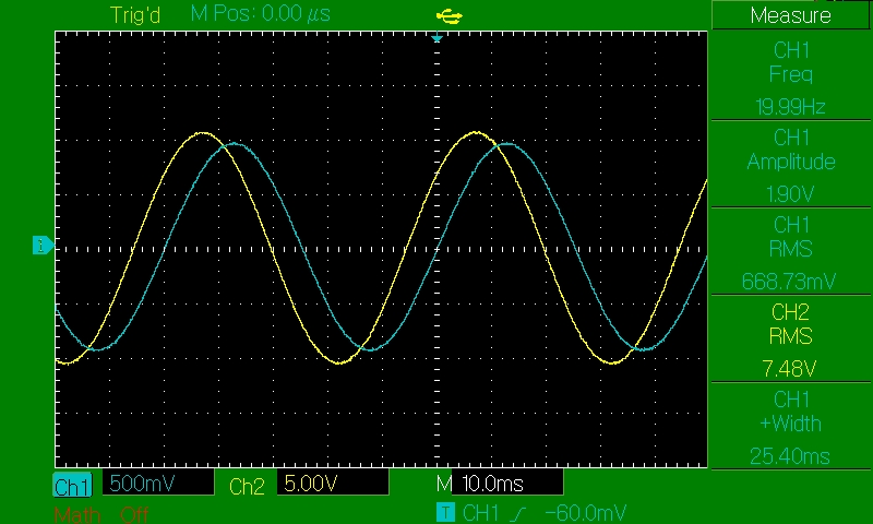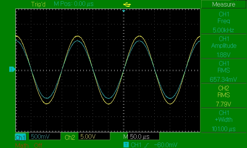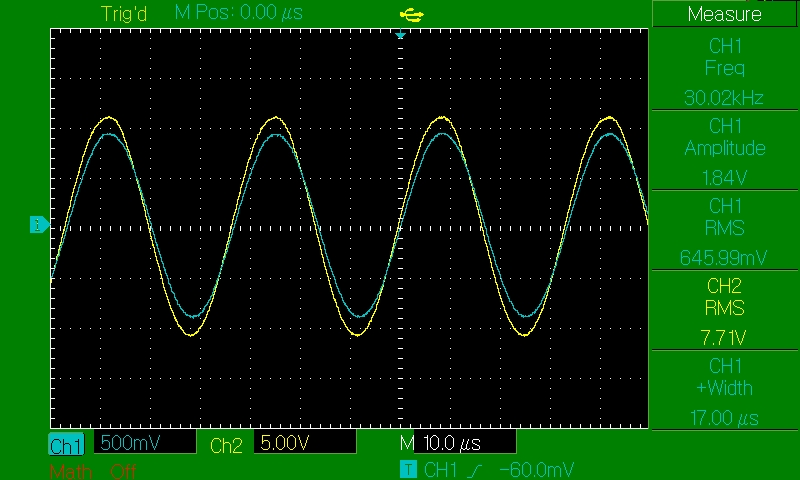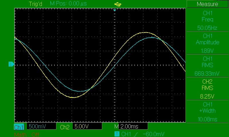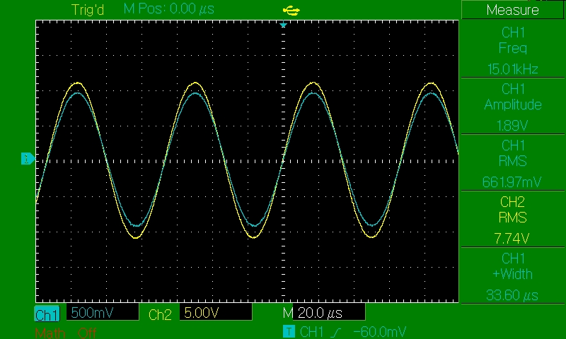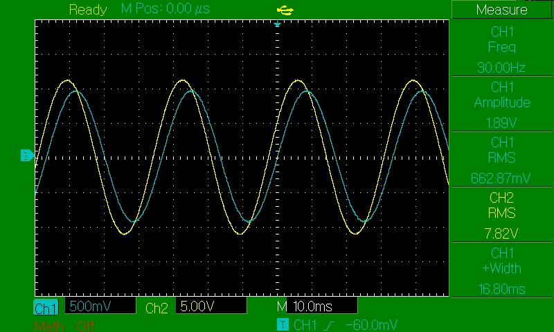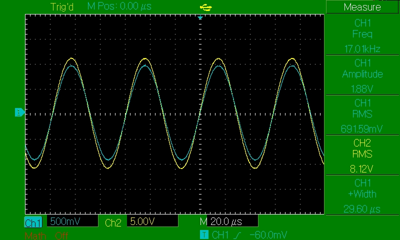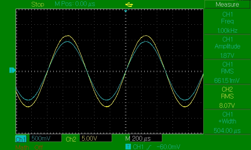 Stažené oscilogramy z mého osciloskopu při plném vybuzení zesilovače do zátěže 8Ω